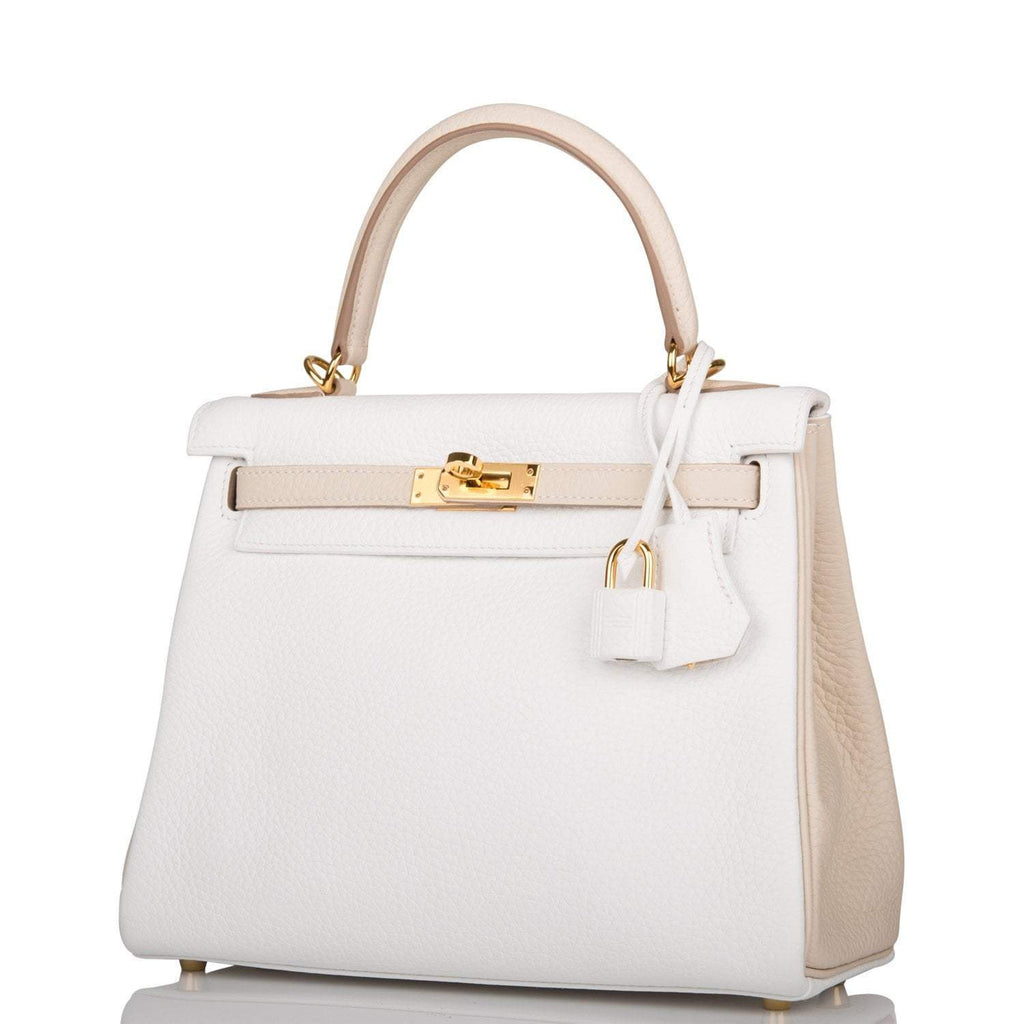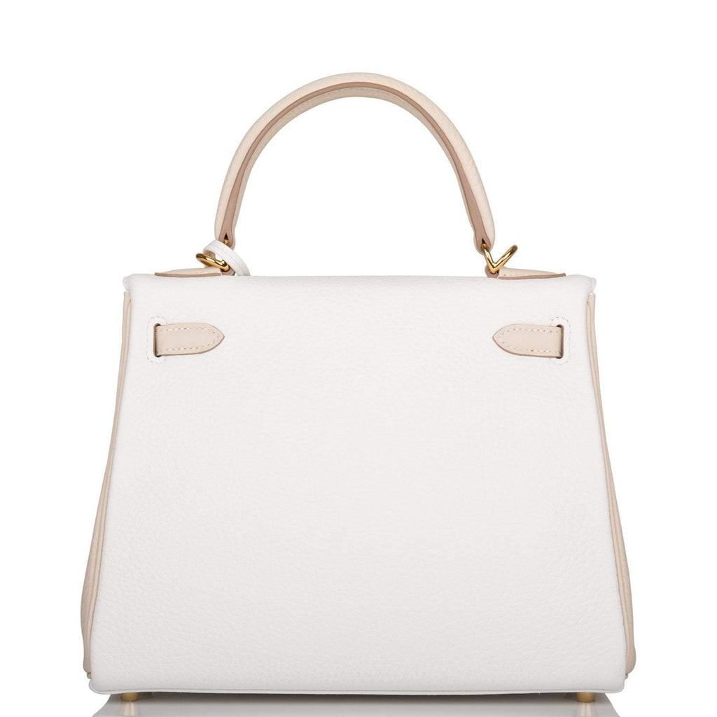 - Hermes Horseshoe Stamp (HSS) Bi-Color White and Trench Clemence Retourne Kelly 25cm Gold Hardware