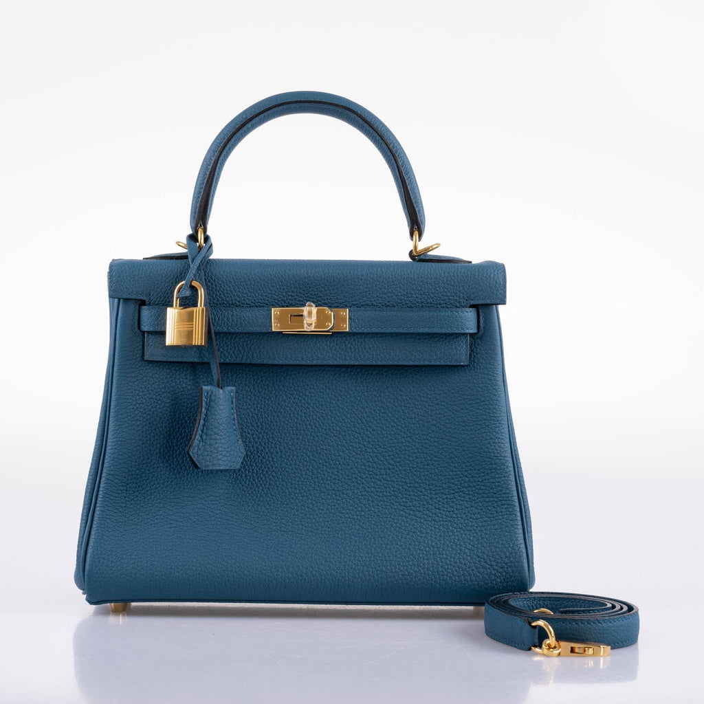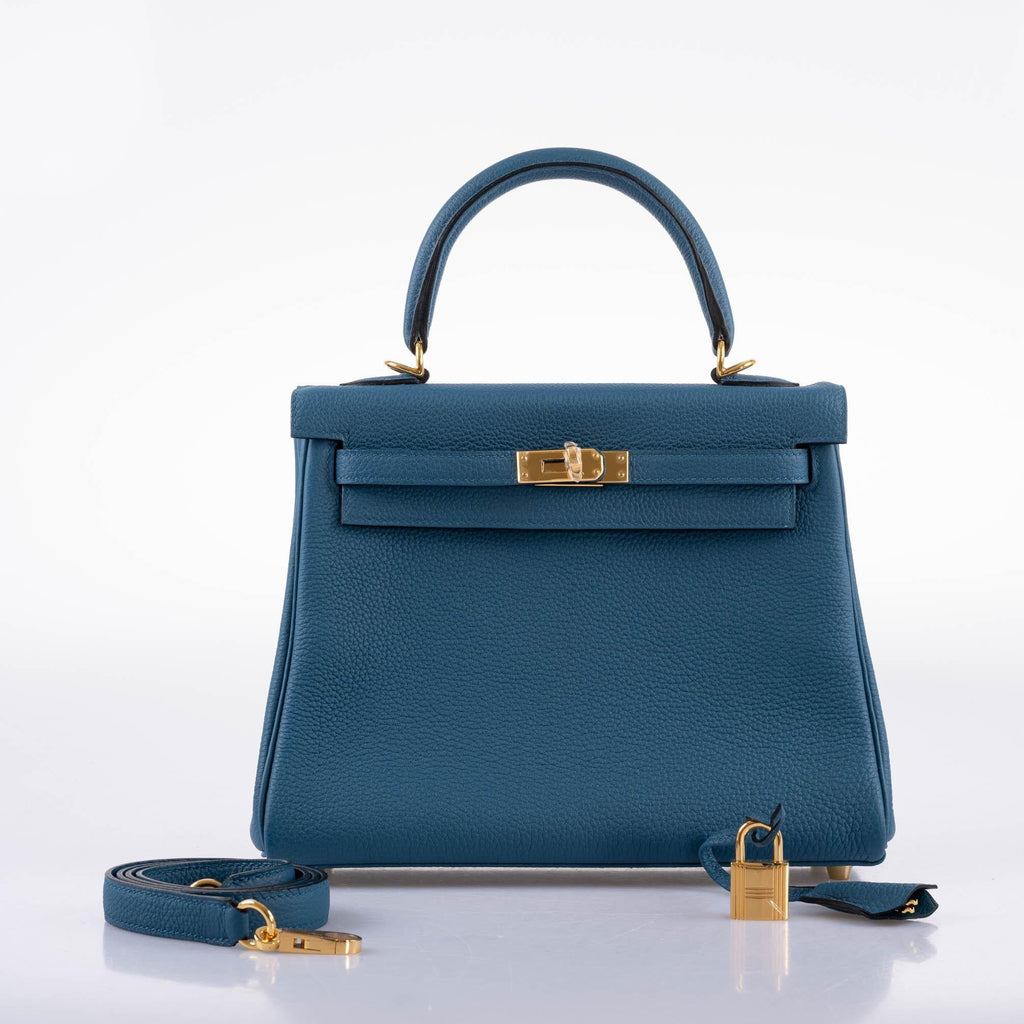 While Hermes is known for their incredible colors, their selection of blues alone spans over forty shades. Some hues such as Blue Jean and Blue Marine are produced for decades, while other shades are more elusive, only popping up for one season before seemingly disappearing entirely. This lovely 25cm Togo leather Kelly is done in Blue Colvert, a rare shade produced by Hermes introduced for 2014 Spring Summer collection, refers to the Mallard duck in French.