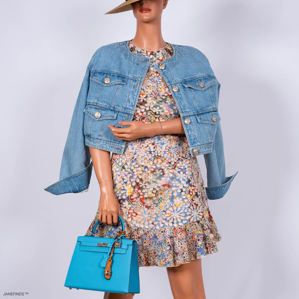 While Hermes is known for their incredible colors, their selection of blues alone spans over forty shades. Some hues such as Blue Jean and Blue Marine are produced for decades, while other shades are more elusive, only popping up for one season before seemingly disappearing entirely. This 25cm Epsom leather Sellier Kelly is done in Bleu du Nord, a neon shade from the Spring/Summer 2019 collection, that is one of the brightest blues produced by Hermes. Smartly paired with Palladium hardware, this jewel of a bag has been kept in Store Fresh condition.