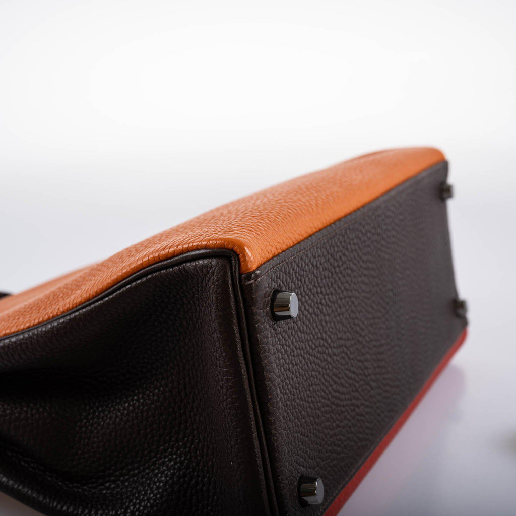 In the early and mid-2000’s Hermes released a handful of Limited Edition Birkins and Kellys. This piece, a 32cm Togo Retourne Kelly, is a prime example of the tri-colored editions released during this period. Boldly sporting a Rouge Vif face and Orange H back and flap, the Ebene handles and straps are tipped seamlessly with Ruthenium hardware. This discontinued gunmetal finish completes the look of this exquisite and rare Kelly. Maintained in excellent condition, this expert pairing of fall-colors is as eye-catching today as it was fifteen years ago, and will be fifteen years from now.