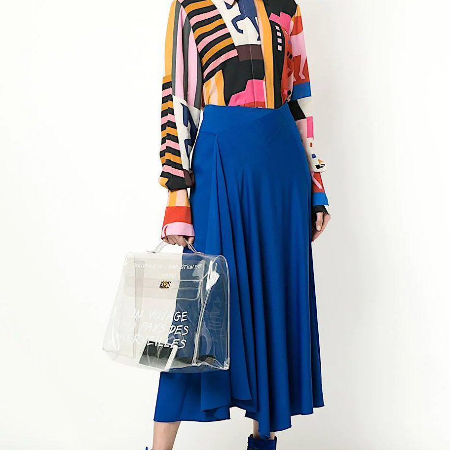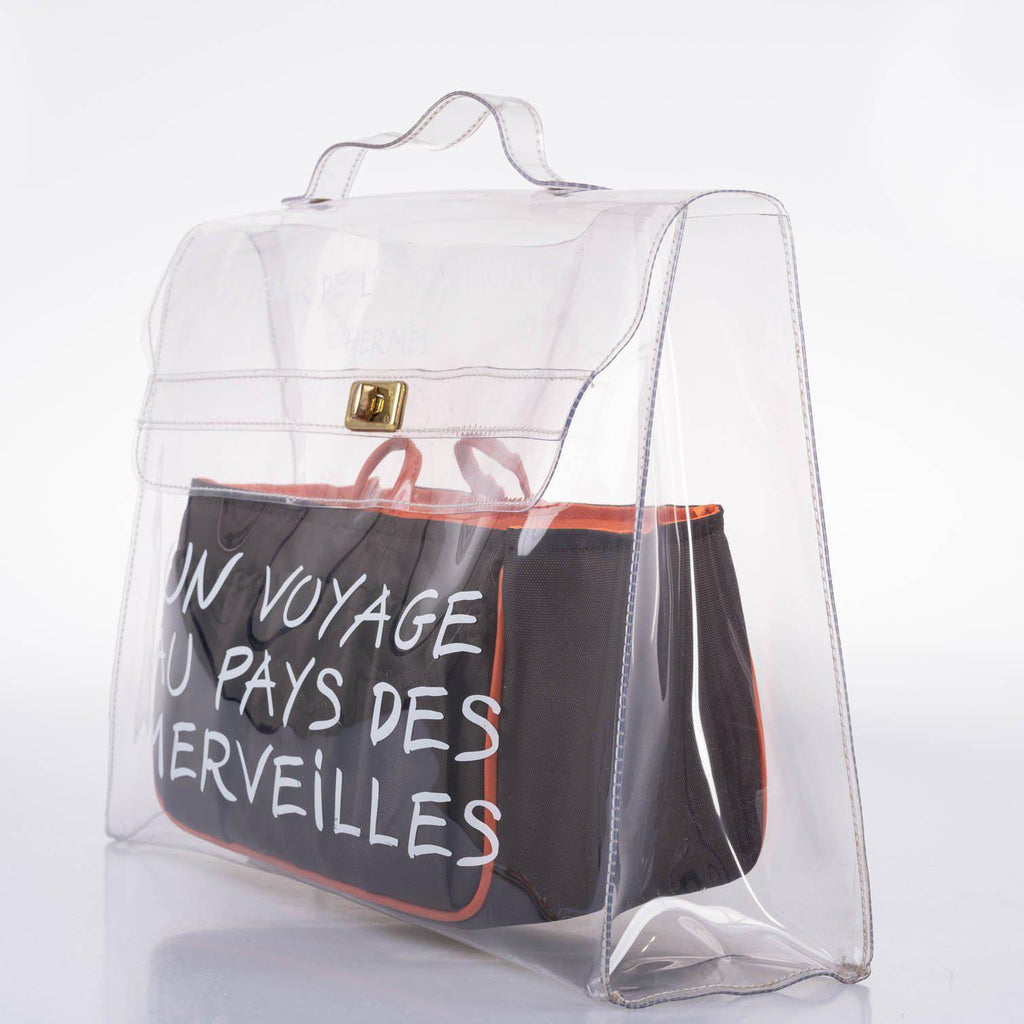 Hermes Vinyl Souvenir De L’Exposition Kelly Transparent. This limited edition tote is crafted of transparent vinyl and features voyage lettering on the front. There is a top handle strap and a cross-over flap with a polished gold Kelly signature turn lock. JaneFinds Kelly Baginizer is included with this Kelly to help organize protect and shape.  Carry this Kelly bag for adventures to the beach or for a relaxed casual look for day, only from Hermes.