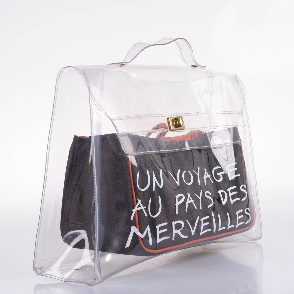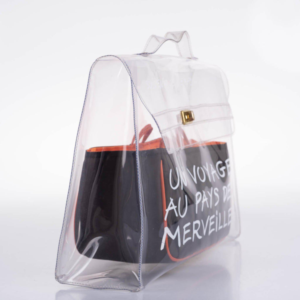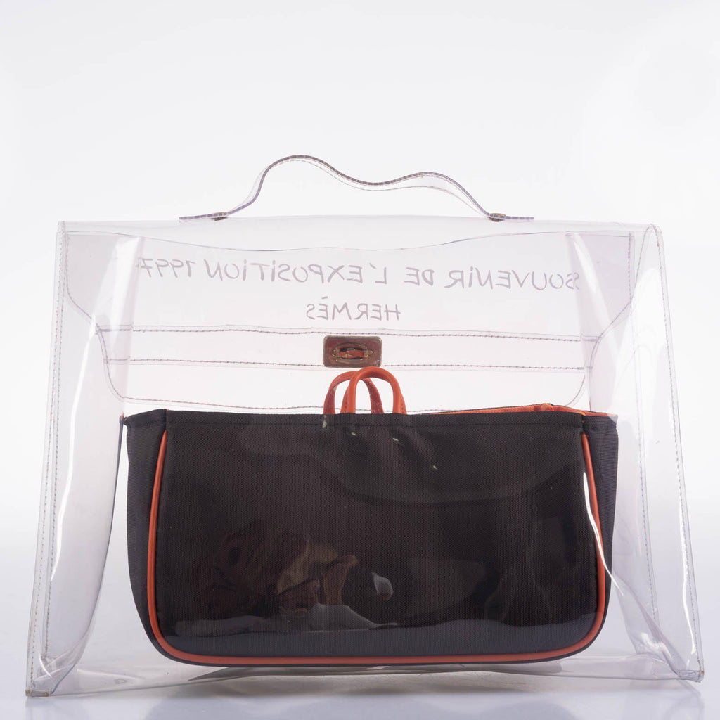 Hermes Vinyl Souvenir De L’Exposition Kelly Transparent. This limited edition tote is crafted of transparent vinyl and features voyage lettering on the front. There is a top handle strap and a cross-over flap with a polished...