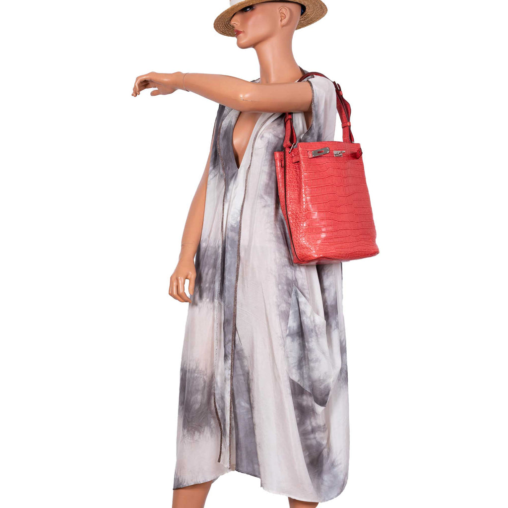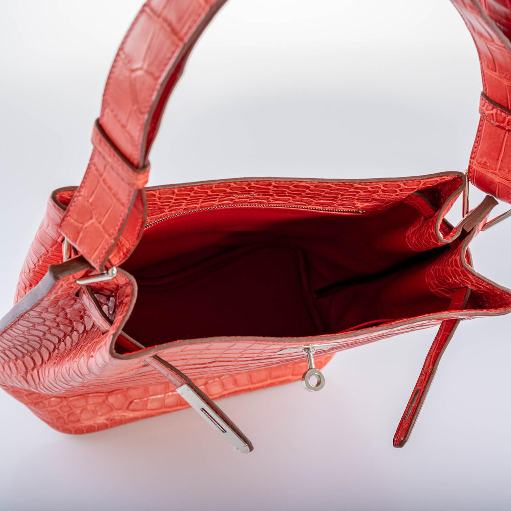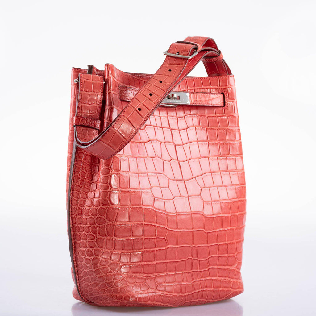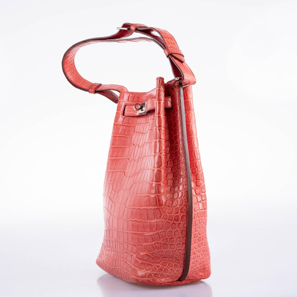 The So Kelly was the product Jean-Paul Gaultier reimagining the iconic Kelly bag as a soft hobo shoulder bag, one of many reinterpretations he sprouted during his tenure. The popular design, which has an adjustable shoulder strap, hourglass-shaped base and open top with the classic Kelly closure at the front, was produced for a number of years, even after JPG’s departure, only recently being discontinued. This exceptional example is done in Bougenville Matte Porosus Crocodile with Palladium hardware, and stunning combination that is both highly luxurious, and casual, easy to wear. The Matte Porosus crocodile patinas beautifully, resisting most wear like moisture and scratches. These bags have become harder and harder to find in recent years, with exotic versions almost never trading. Kept in pristine condition with plastic on hardware.