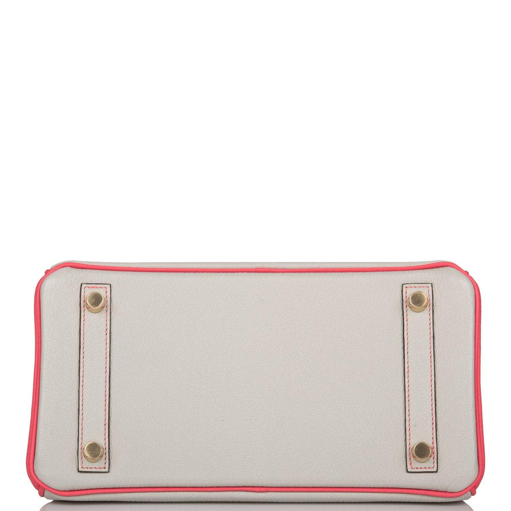 This Special Order Birkin Bi Color is in Gris Perle and Rose Azalee chevre leather with brushed gold hardware and has contrast stitching, front flap, two straps with center toggle closure, clochette with lock and two keys, and double rolled handles.