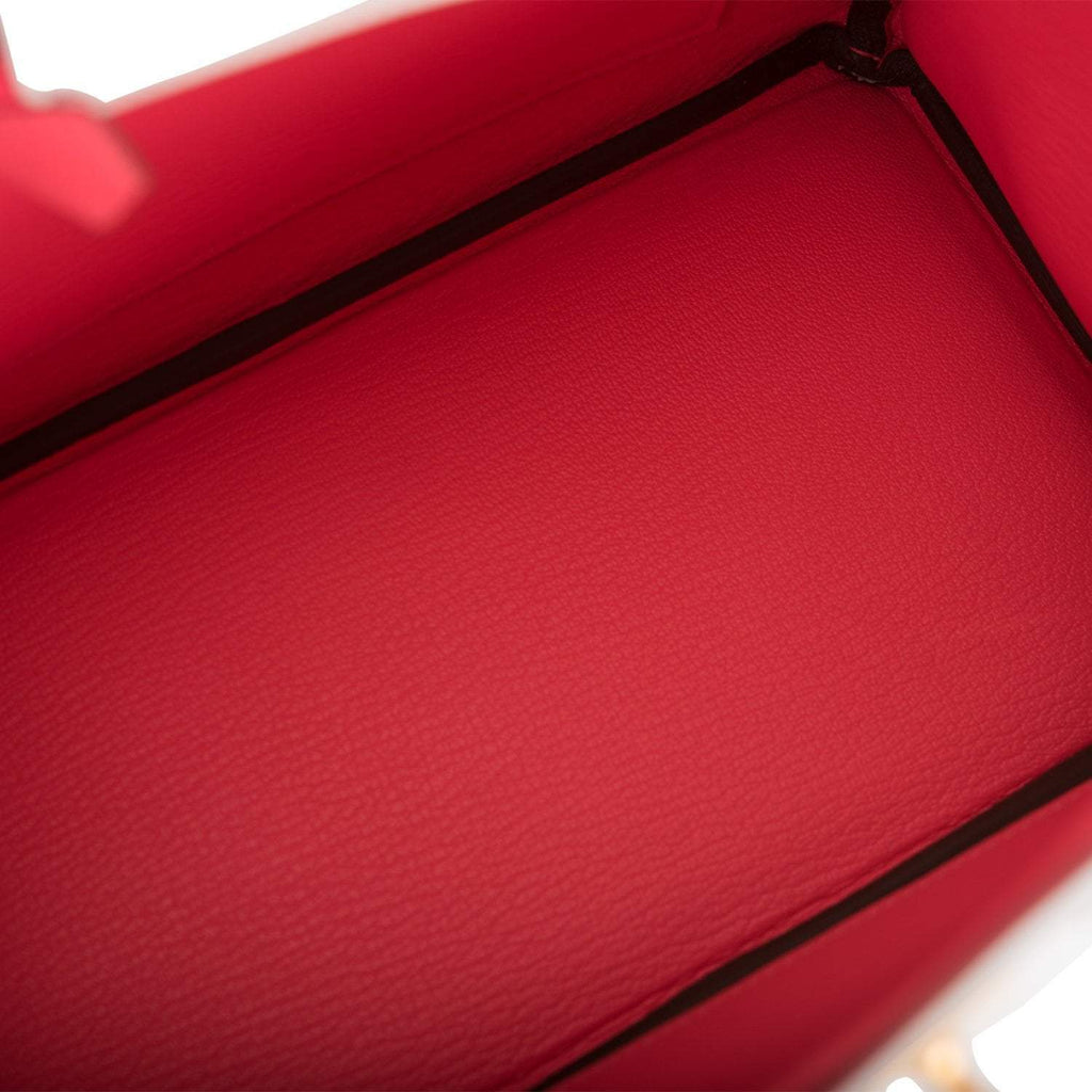 The interior is lined with Rose Azalee chevre and has one zip pocket with an Hermes engraved zipper pull and an open pocket on the opposite side.