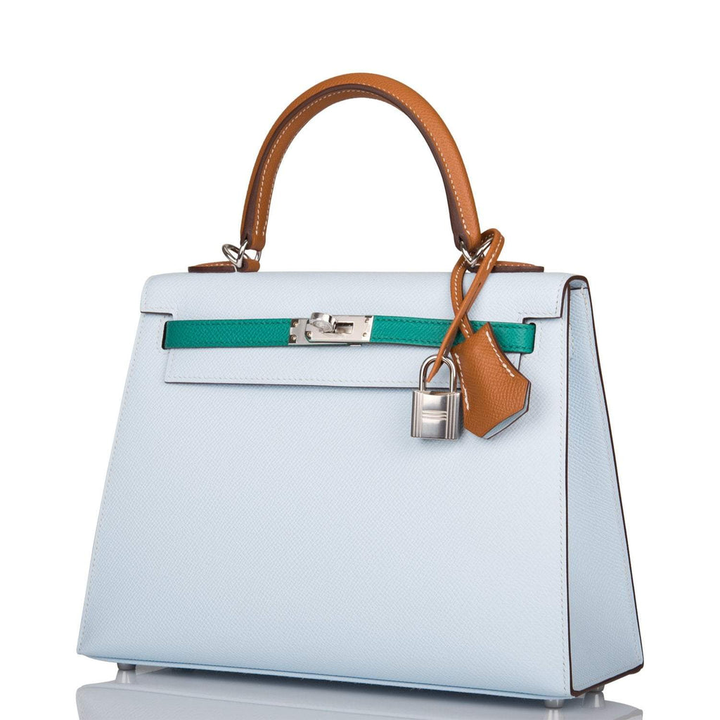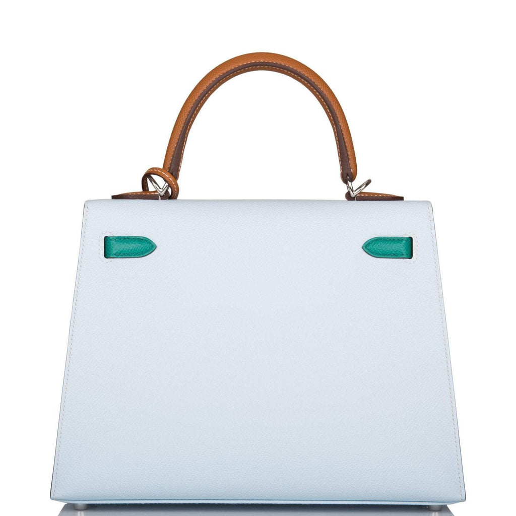 - Hermes Tri-Color Bleu Brume, Vert Jade and Gold Epsom Sellier Kelly 25cm Palladium Hardware