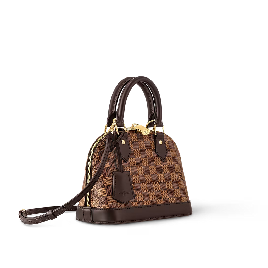 The Alma BB handbag traces its pedigree to the Art Deco original, introduced in 1934. Signature details impart a timeless elegance to this model made from graphic Damier Ebene canvas: note the golden padlock and keys, twin Toron handles and chic leather key bell. Equipped with a removable and adjustable strap, this charming small bag is perfect for cross-body wear.