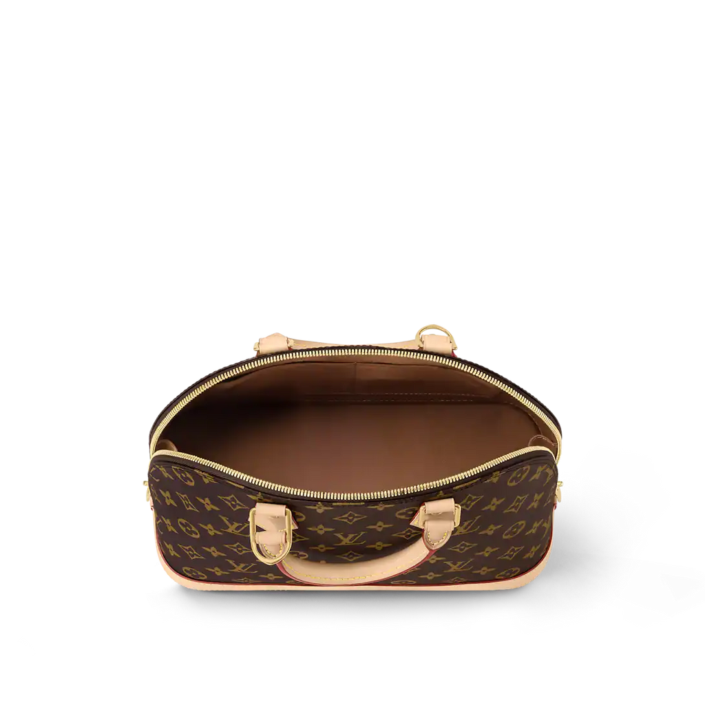A timeless House icon, the Alma PM handbag is ideal for every day. Its structured lines recall the Art Deco original, introduced in 1934 and named for the Alma Bridge in Paris. Crafted from Monogram canvas, with hand-stitched Toron handles, natural cowhide trim and high-shine golden hardware, this signature model always looks elegant, carried by hand or on the elbow.