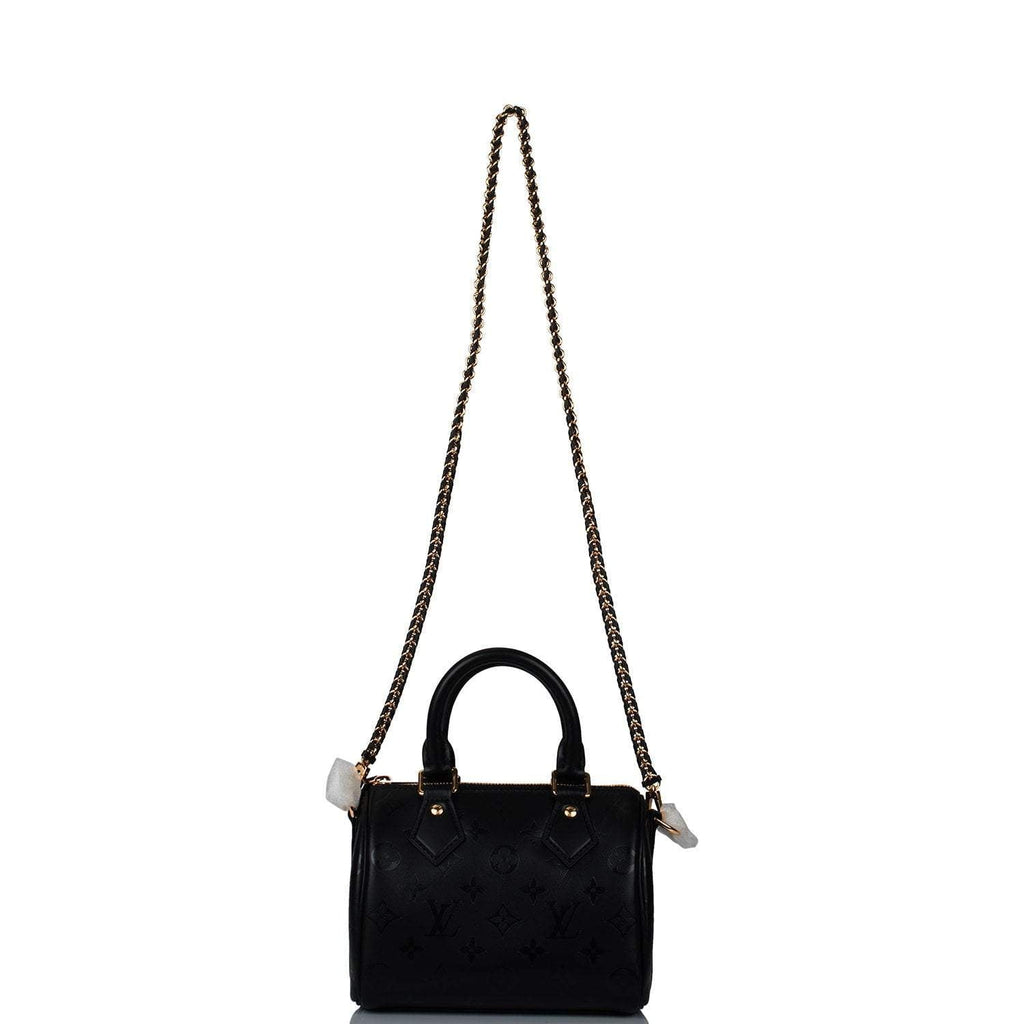 This limited edition Ink Speedy BB is of black leather with polished brass hardware and features a removable black luggage tag, black leather top handles, trim and removable chain strap with zip top closure.