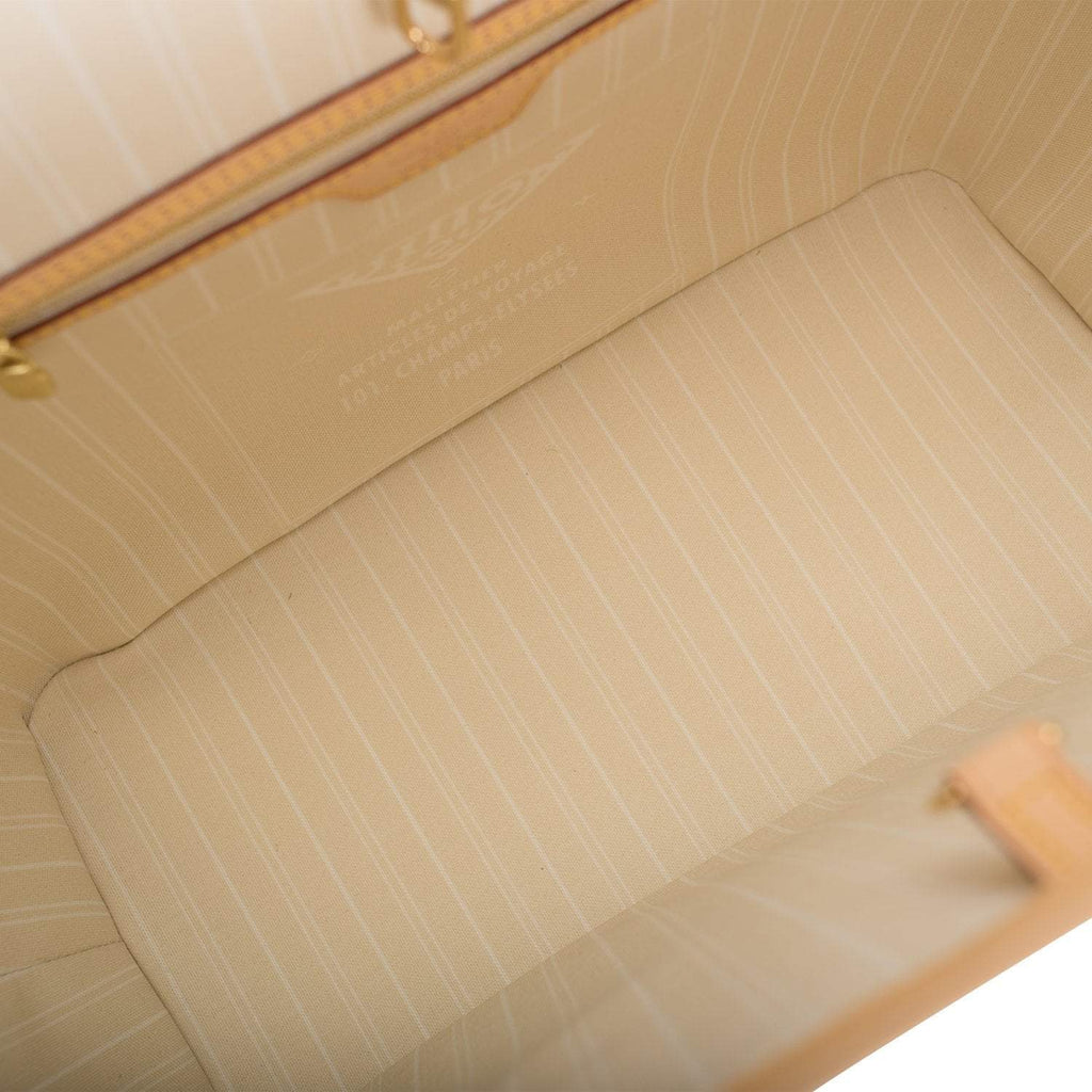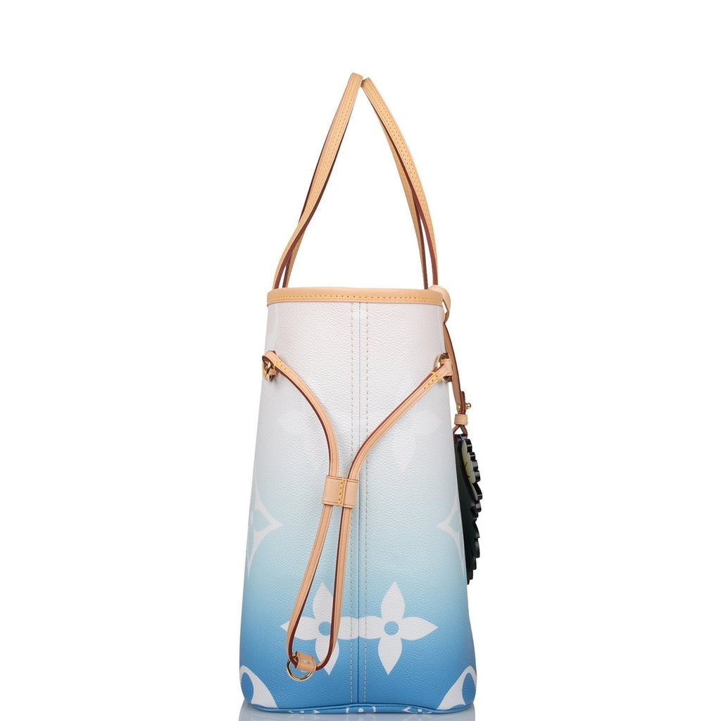 This "By The Pool" Neverfull tote is of blue coated canvas with polished brass hardware and features giant monogram print, gradient print, removable charm, removable pouch, vachetta leather top handles, trim and hidden top hook...