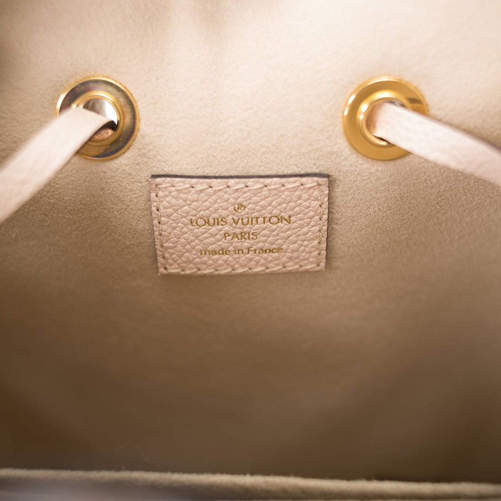 This "By The Pool" NeoNoe BB tote is of creme saffron empreinte calfskin leather with polished brass hardware and features giant monogram print, cinch top closure, creme leather trim, removable top handle and removable adjustable shoulder/crossbody strap.