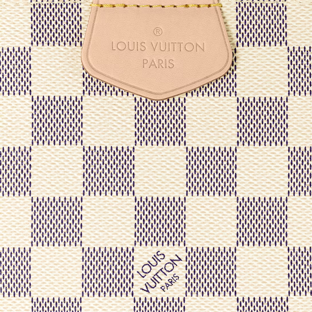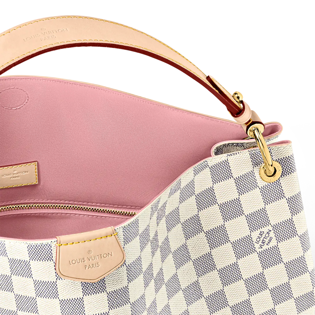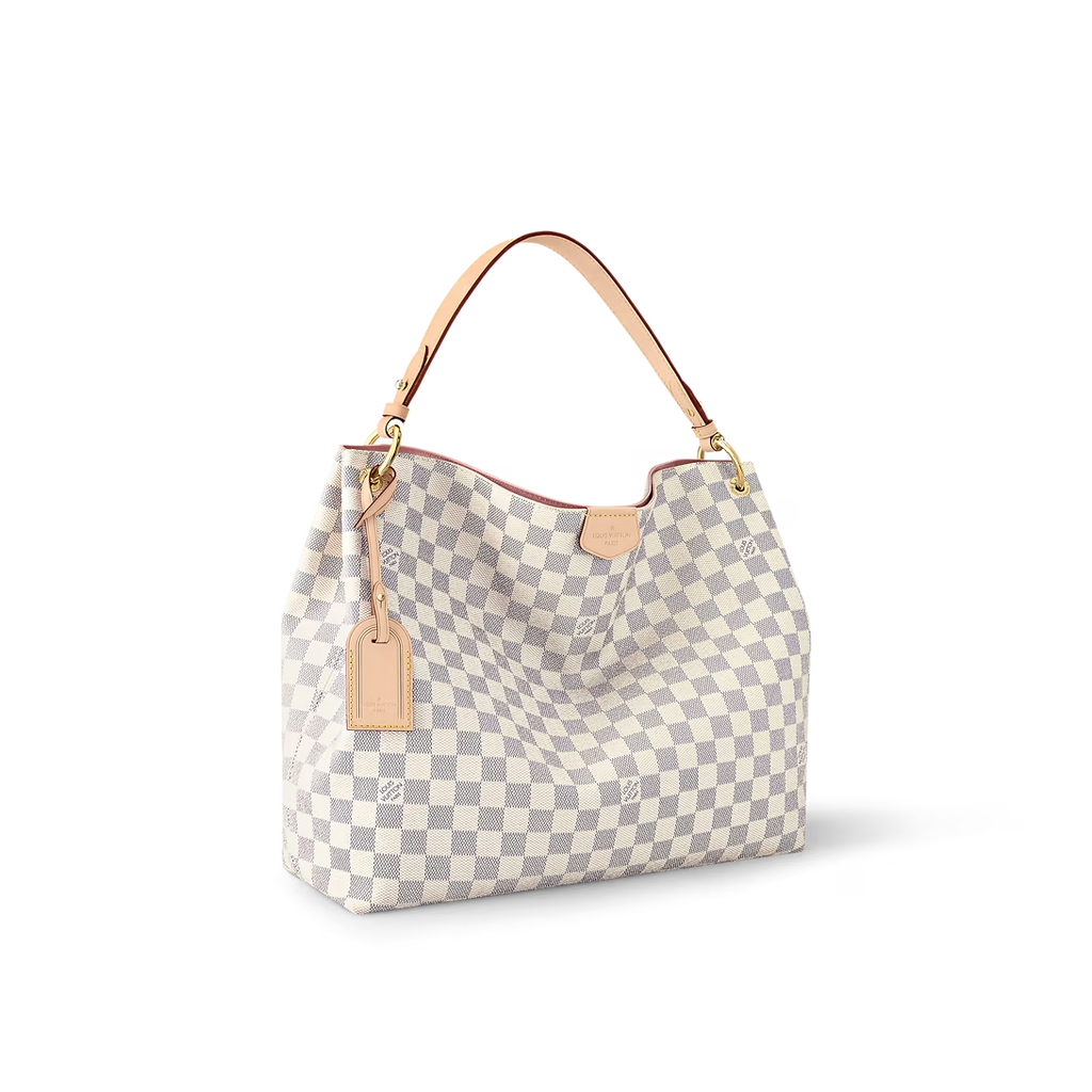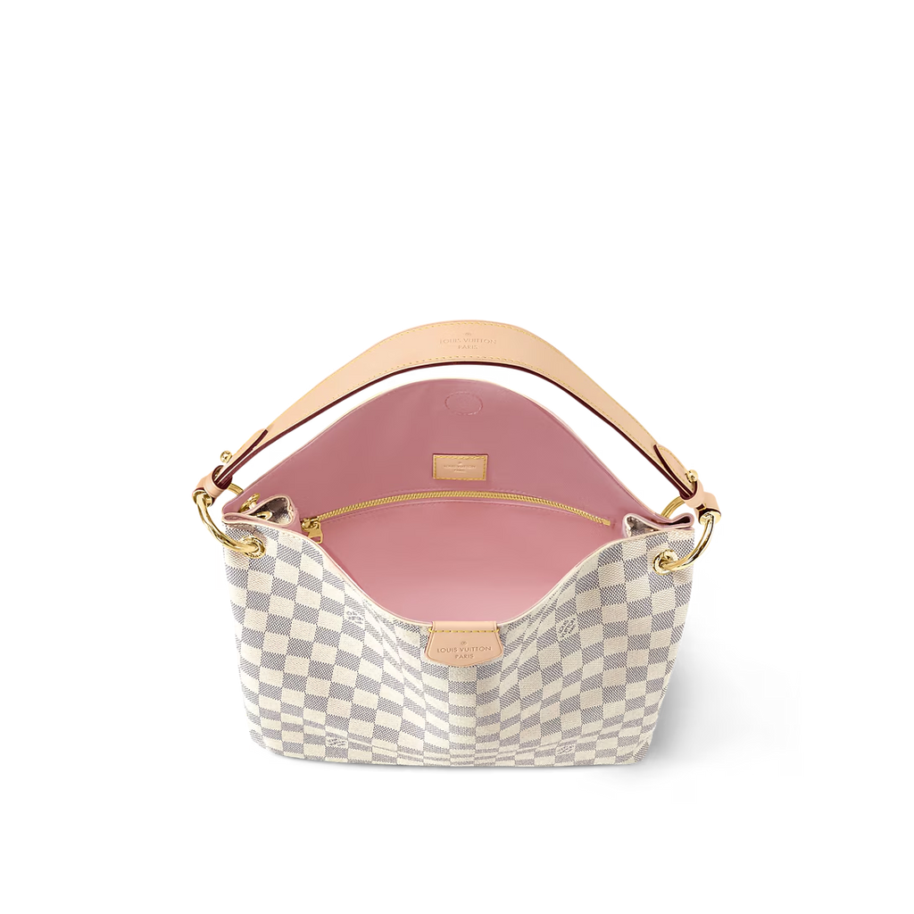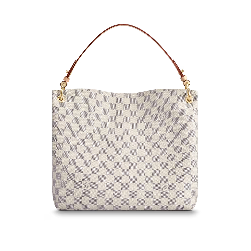 The Graceful PM hobo in fresh Damier Azur canvas is a lightweight, roomy bag to carry every day. Natural cowhide leather detailing and golden hardware add a refined touch. The body-friendly design combines with a supple, flat handle for stylish and comfortable over-the-shoulder wear. The magnetic closure and zipped inside pocket keep belongings secure.