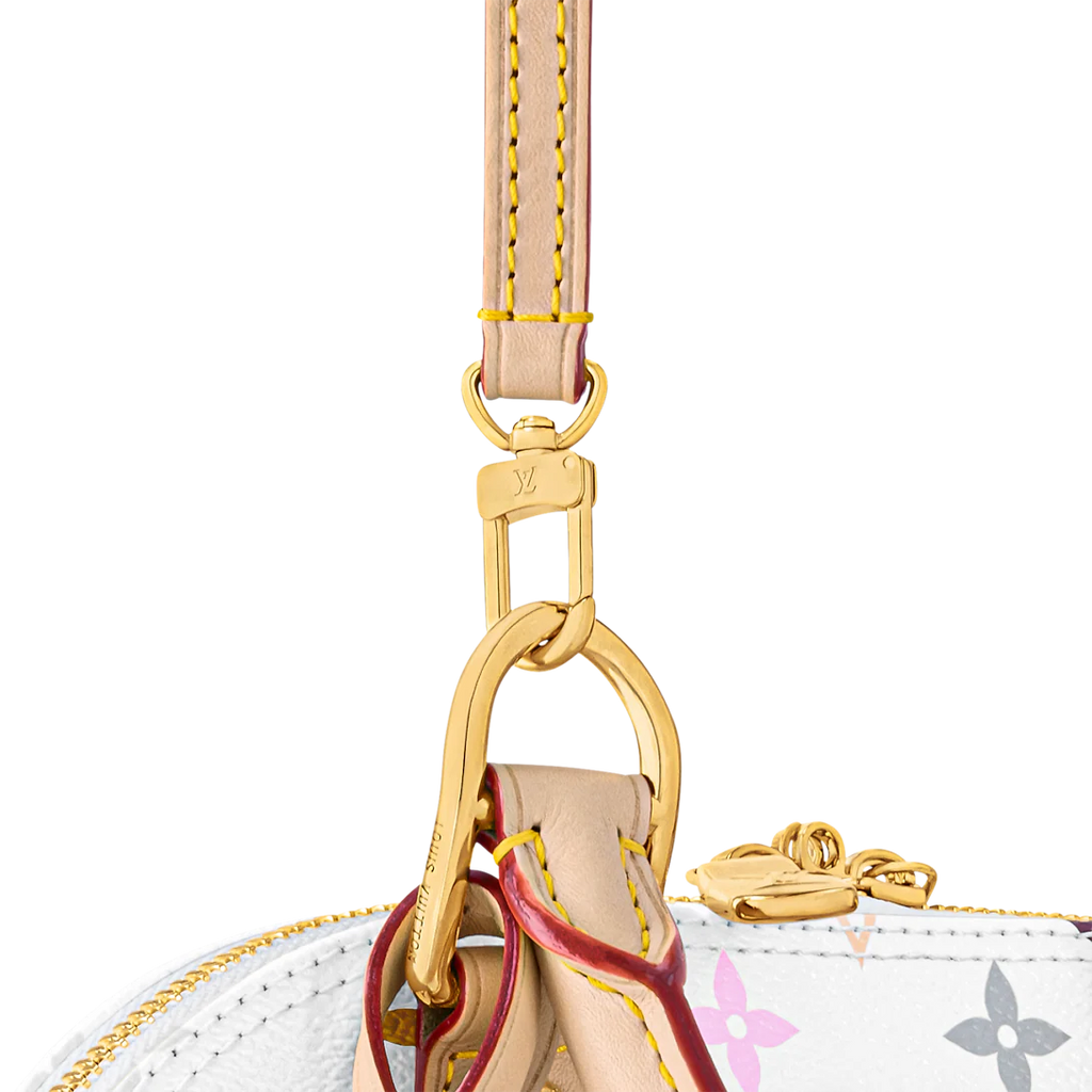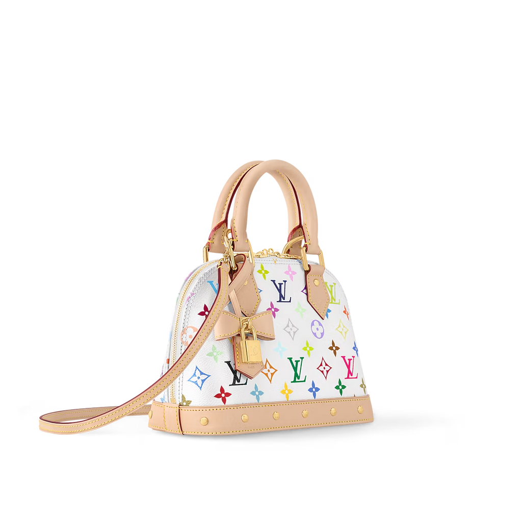 Originally inspired by a 1930s Art Deco design, this edition of the Alma BB has a celebratory spirit in the Louis Vuitton x Murakami collection’s multicolored Monogram coated canvas, which draws on the Japanese artist’s playful palette. The House’s natural cowhide leather adds an emblematic touch to the refined Toron top handles, the bottom, the removable strap, and the exclusive LV x TM keybell.