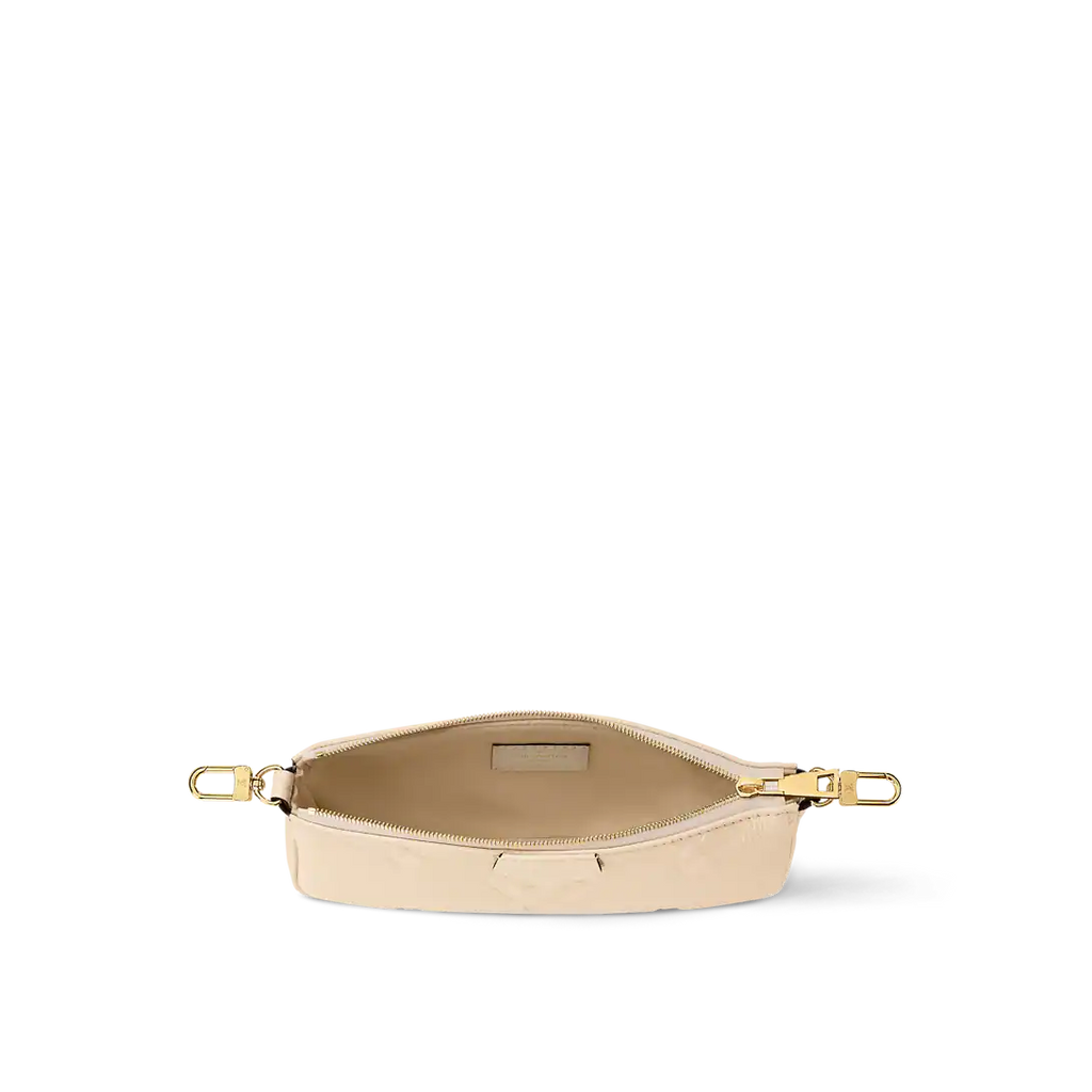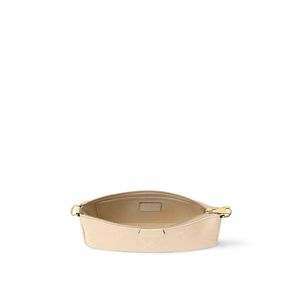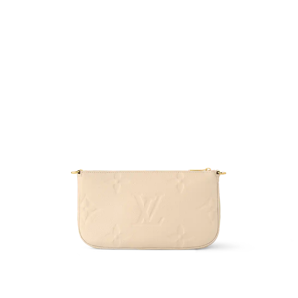Made from cream-colored Monogram Empreinte leather, the Multi Pochette Accessoires handbag is composed of two pouches attached together. Both pouches are lined with matching cream-color microfiber, with the larger pouch also including an inside pocket. Thanks to a chain and a strap, both removable, this bag becomes very verstaile.