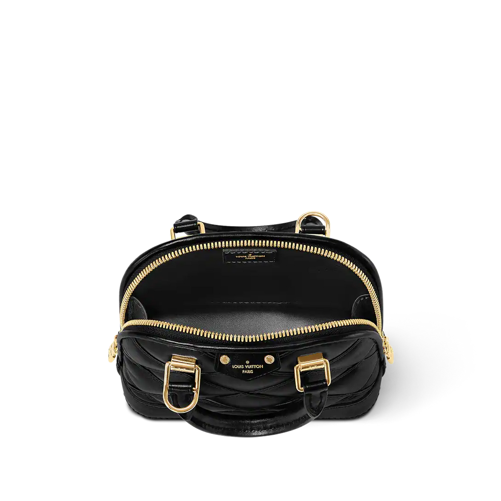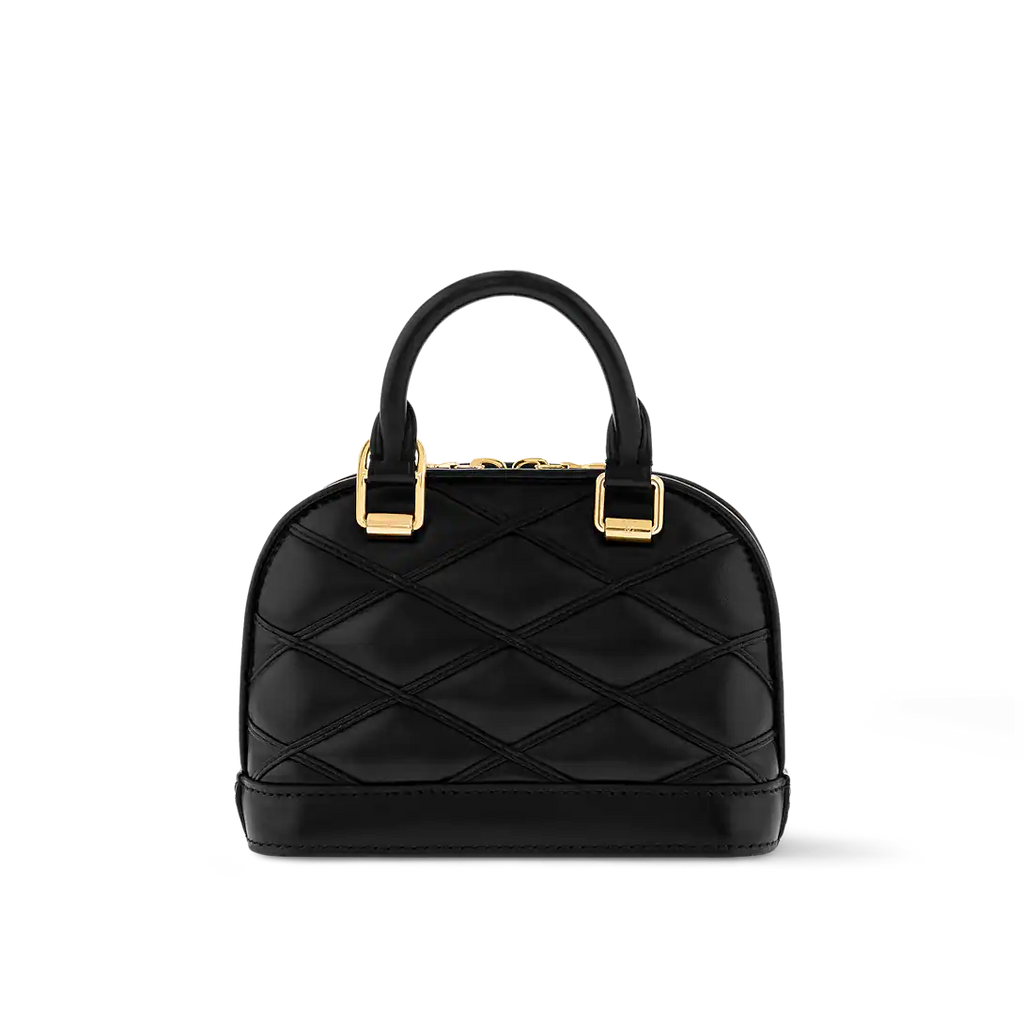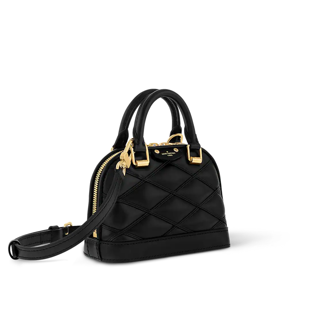 The Nano Alma is a miniature replica of Louis Vuitton's iconic Alma bag. This edition is crafted from soft lamb leather with a quilted Malletage pattern that references the crisscross lining of the House's historic trunks. This design conveys refinement, offering different looks and carry options thanks to its two handles, gold-tone chain and removable, adjustable leather shoulder strap.