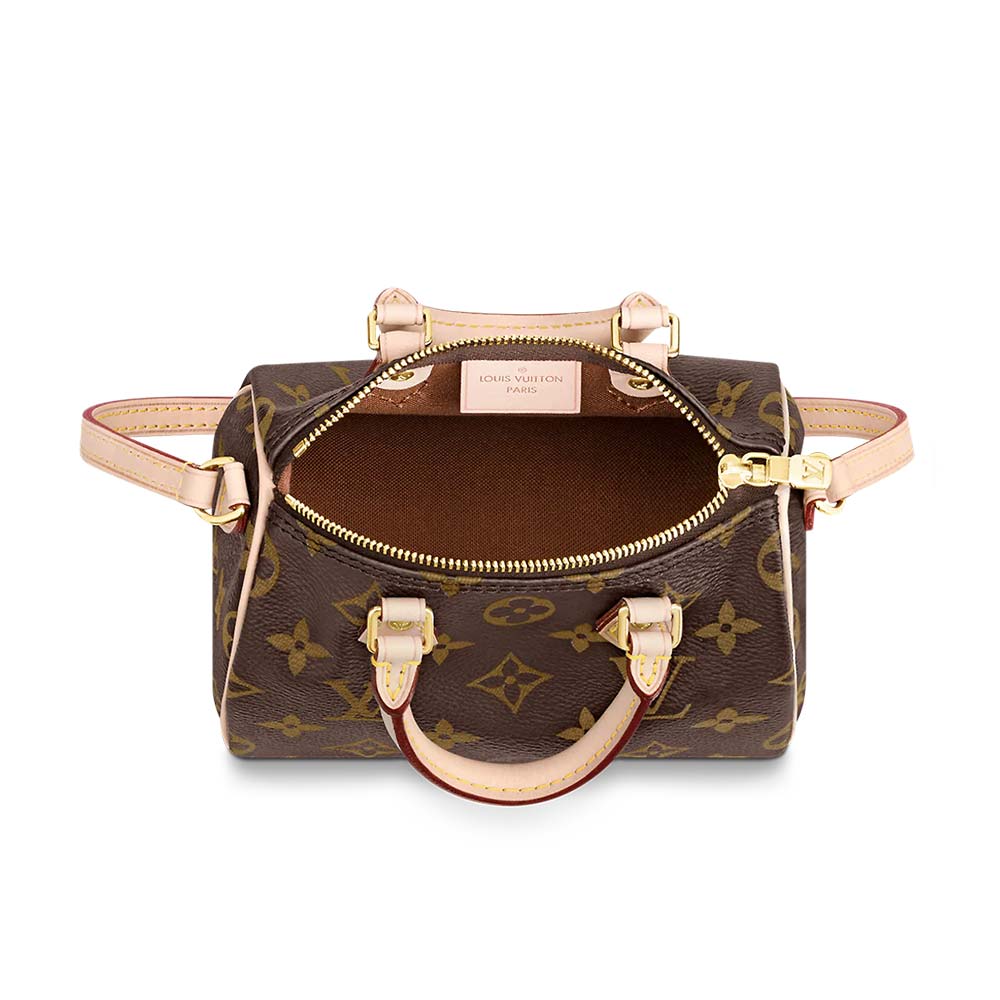 The Nano Speedy is a perfect miniature version of Louis Vuitton's iconic Speedy bag. Crafted from Monogram canvas with natural leather trim, it features two handles and a long strap for shoulder or cross-body carry. Extremely lightweight and large enough for a smartphone, cards and keys, it is a stylish way to carry essentials.