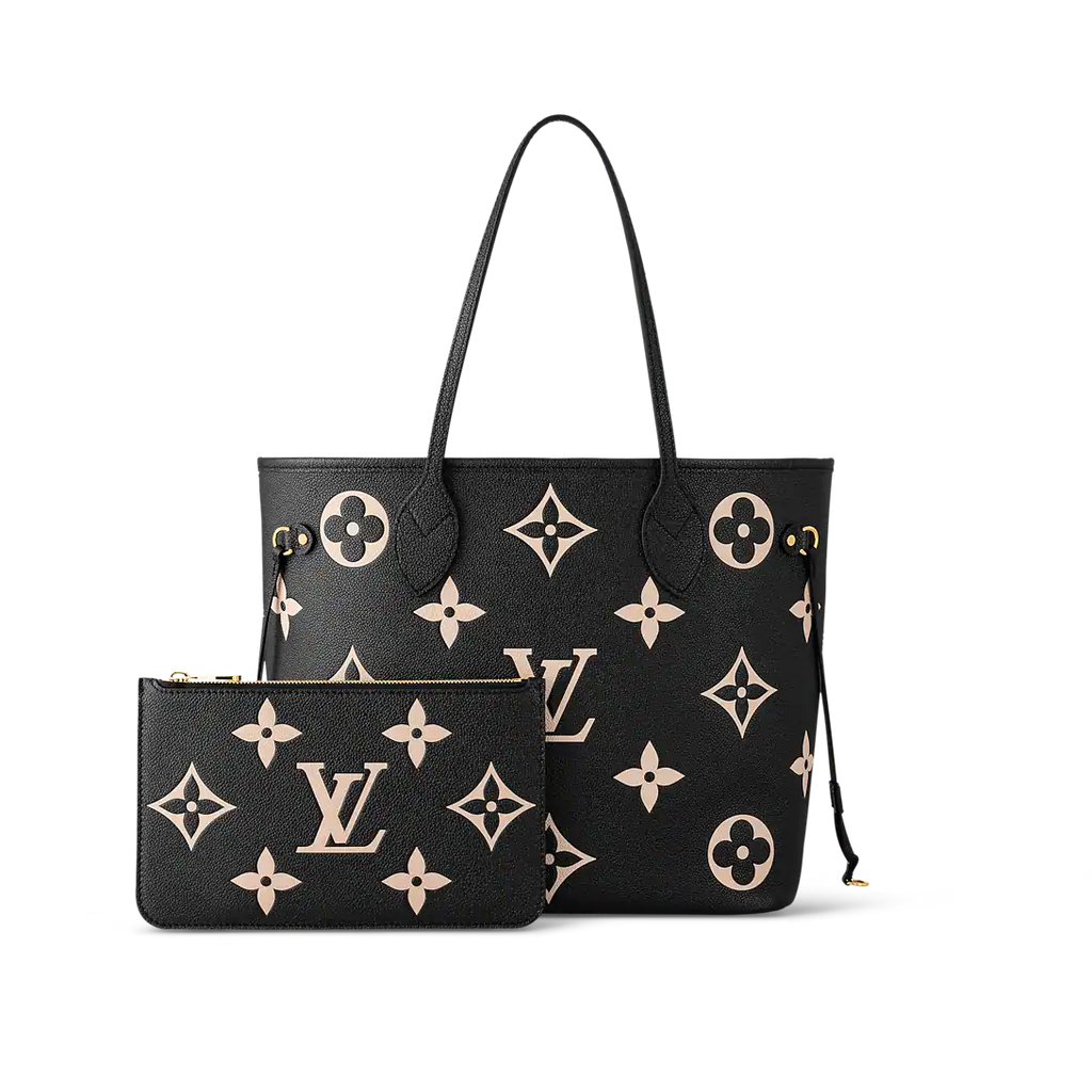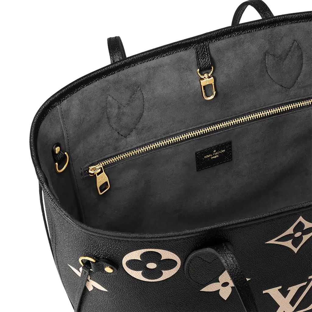 Ideal for everyday use, the roomy Neverfull MM tote bag is made from black cowhide leather with the Monogram pattern embossed then printed in beige on the leather. Cinch the side laces and this tote transforms into an elegant city bag. It can be carried on the shoulder or the elbow, thanks to the long shoulder handles.