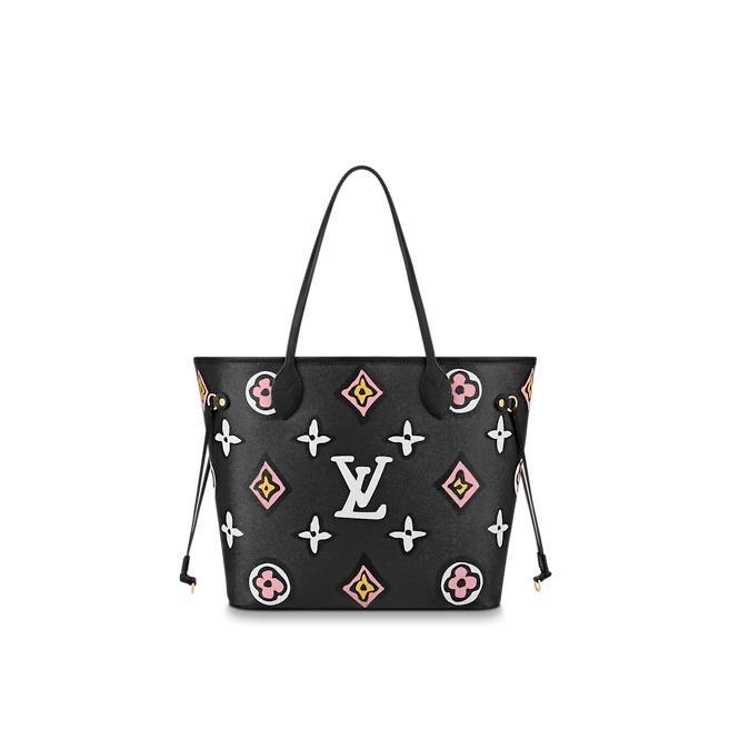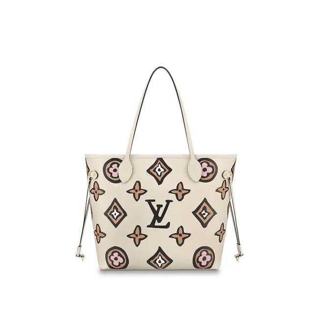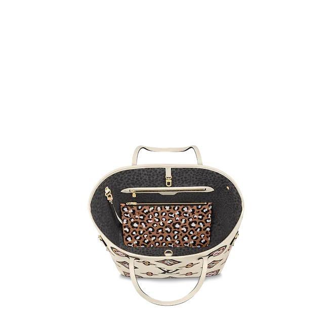 The Neverfull MM tote is arrayed this season in an exclusive Monogram print inspired by an archival design. Part of the Wild at Heart capsule, it has a boldly graphic, hand-painted look. This roomy carryall can be slipped over the shoulder or elbow and comes with a separate zipped pouch that can serve as a clutch or extra pocket.