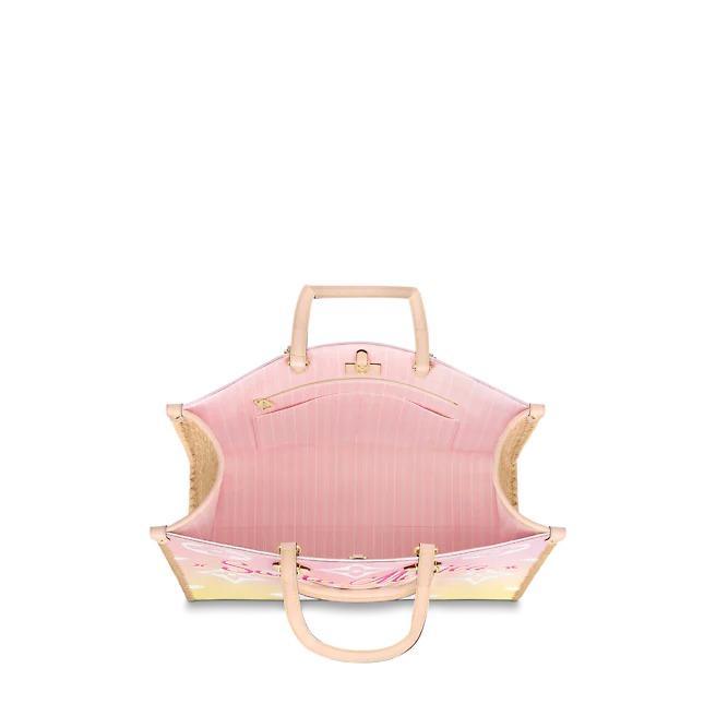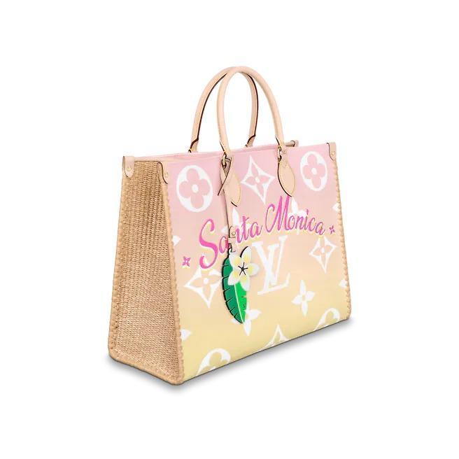 For Resort 2021, the OnTheGo GM tote bag is fashioned from gradient pastel Monogram Giant canvas with woven raffia gussets. The bag features the name of a resort city and a leather charm specially designed for that destination. Spacious and easy to carry by its shoulder straps or top handles, this large tote is a versatile everyday bag.