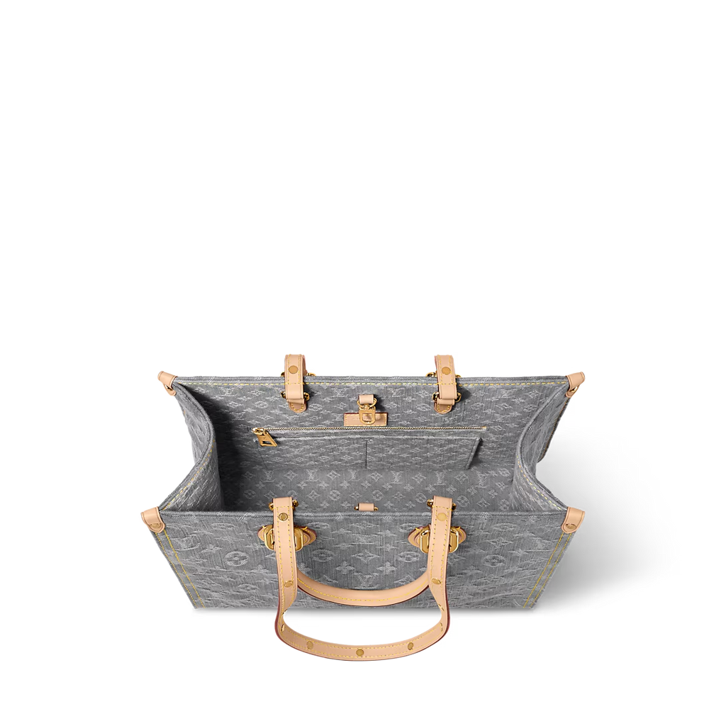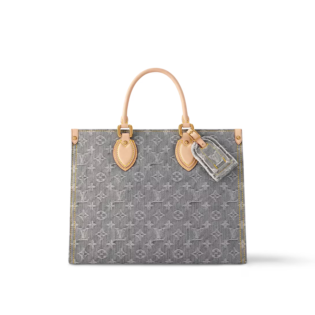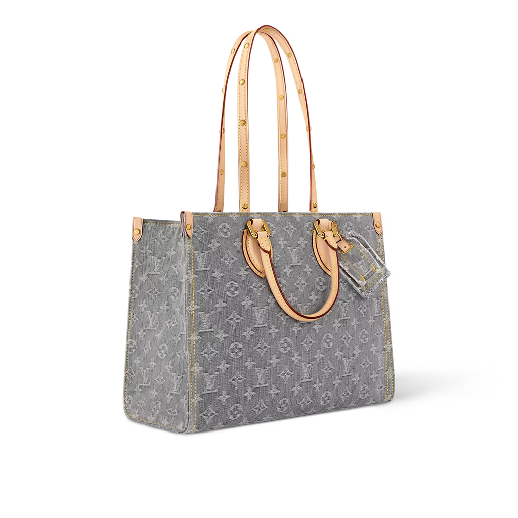 This edition of the OnTheGo MM celebrates the return of the iconic Monogram Denim pattern from 2005. It is crafted from organic cotton that is skillfully woven with black and white threads, then bleached using a special Louis Vuitton technique to create a vintage-inspired finish. Sized to store a laptop, it is elevated with light gold-toned hardware and includes signature details such as the natural leather trims and a removable name tag.