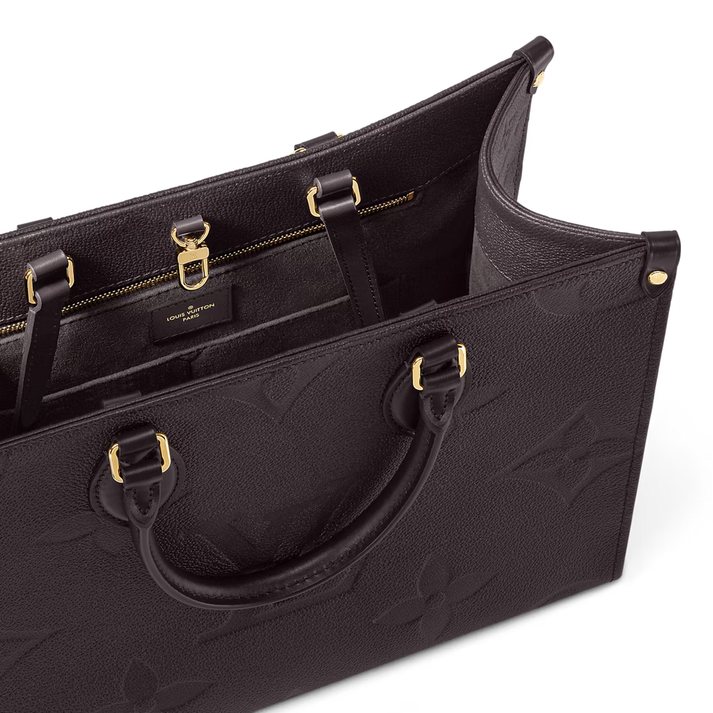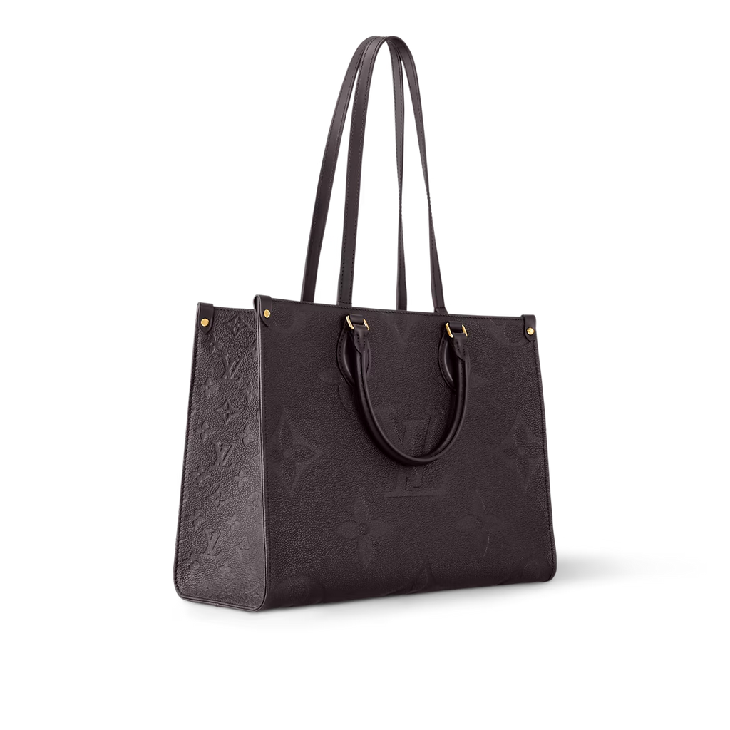 The OnTheGo MM handbag is reimagined for the season in a rich chocolate shade, accented with gold-toned hardware. The iconic style showcases the House’s Monogram Empreinte leather and includes a removable name tag with a mirror detail. It is fitted with multiple interior pockets and is sized to store a Zippy wallet, plus a laptop. Use the longer handles for shoulder carry.