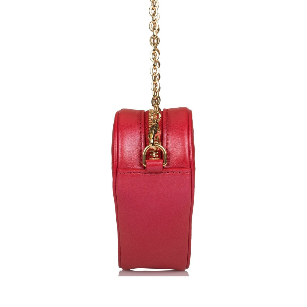 This limited edition Heart on Chain bag is in red embossed lambskin with golden tone hardware and features a removable gold chain which can be used for crossbody or shoulder wear and zip top closure....