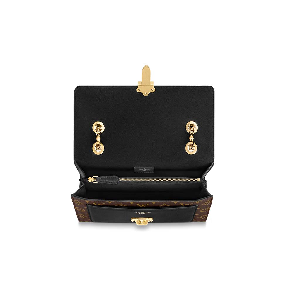 The Victoire chain bag pairs Monogram canvas with smooth coloured leather for a sophisticated day-to-evening accessory. The golden clasp is modelled on the lock of classic Louis Vuitton luggage, while the sliding chain strap echoes the Malletage print that lined those historic trunks. Large enough to fit a long wallet, the bag can be worn cross-body or short-shoulder style.