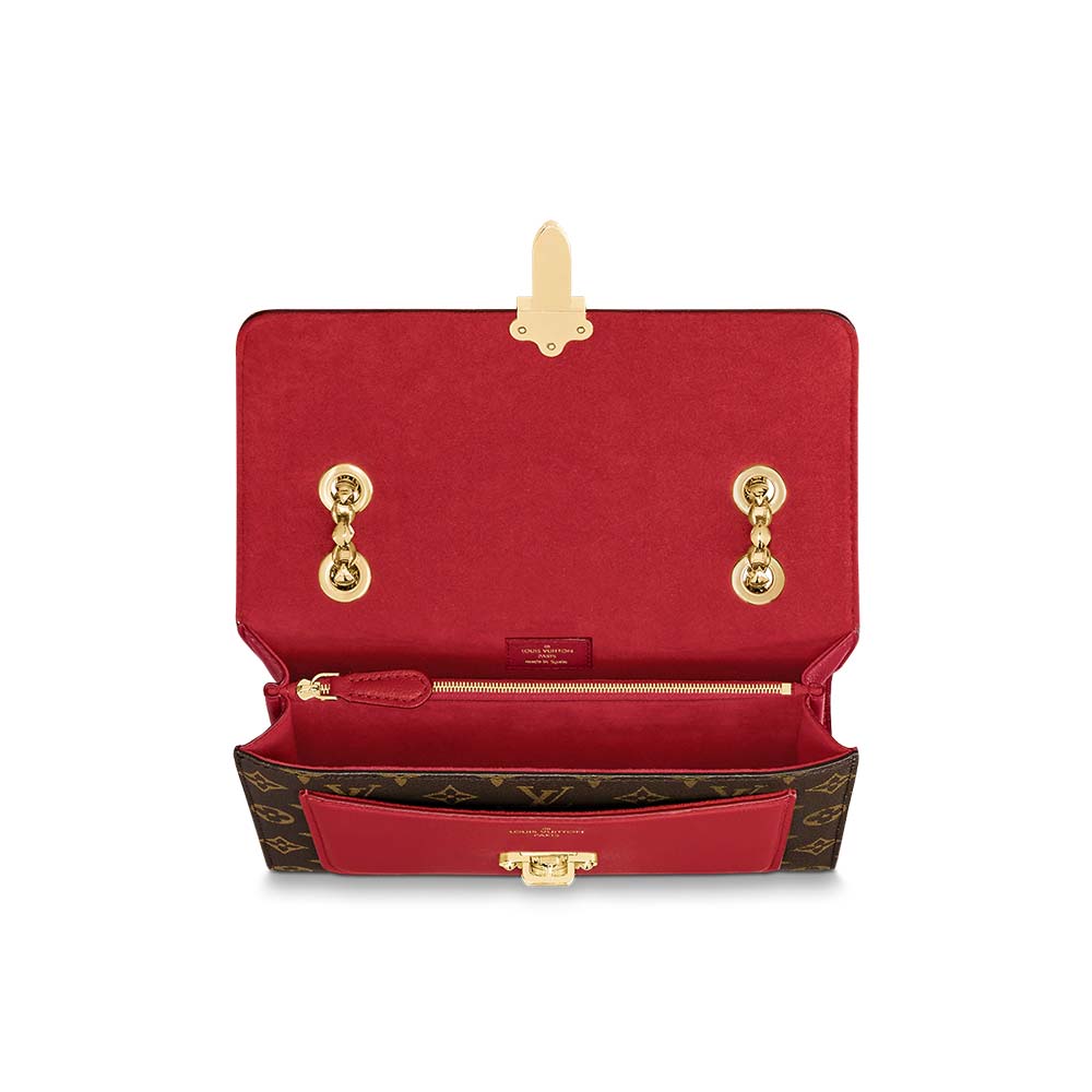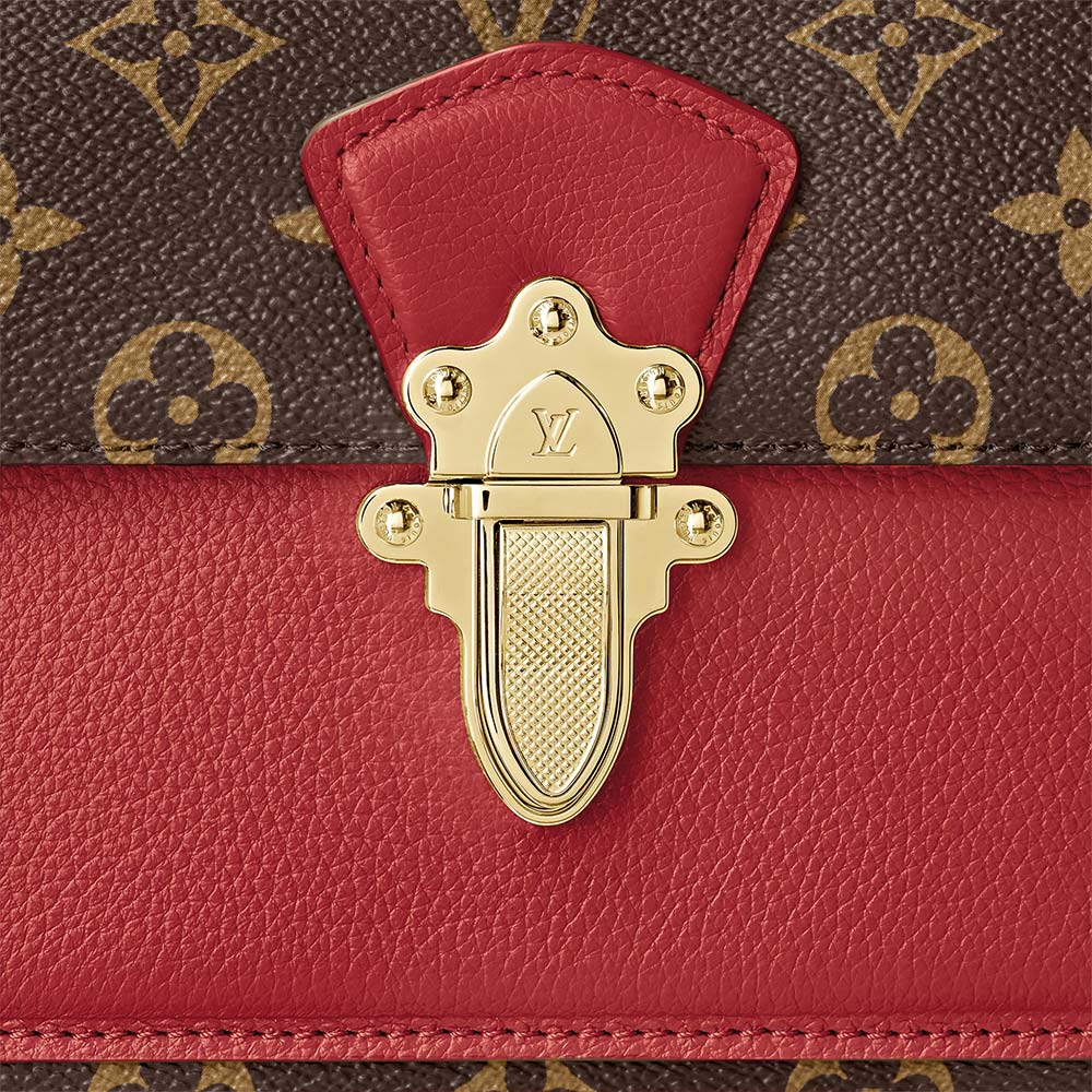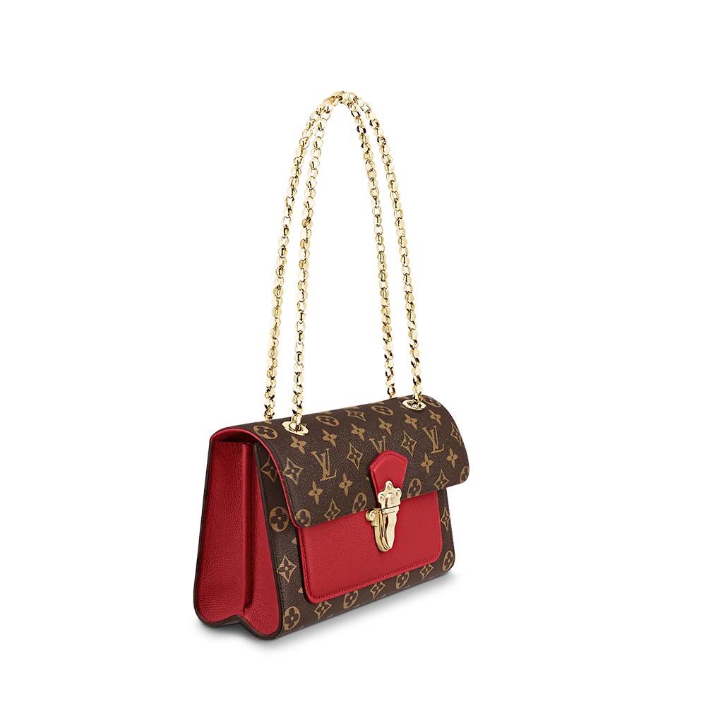 The Victoire chain bag pairs Monogram canvas with smooth coloured leather for a sophisticated day-to-evening accessory. The golden clasp is modelled on the lock of classic Louis Vuitton luggage, while the sliding chain strap echoes the Malletage print that lined those historic trunks. Large enough to fit a long wallet, the bag can be worn cross-body or short-shoulder style.