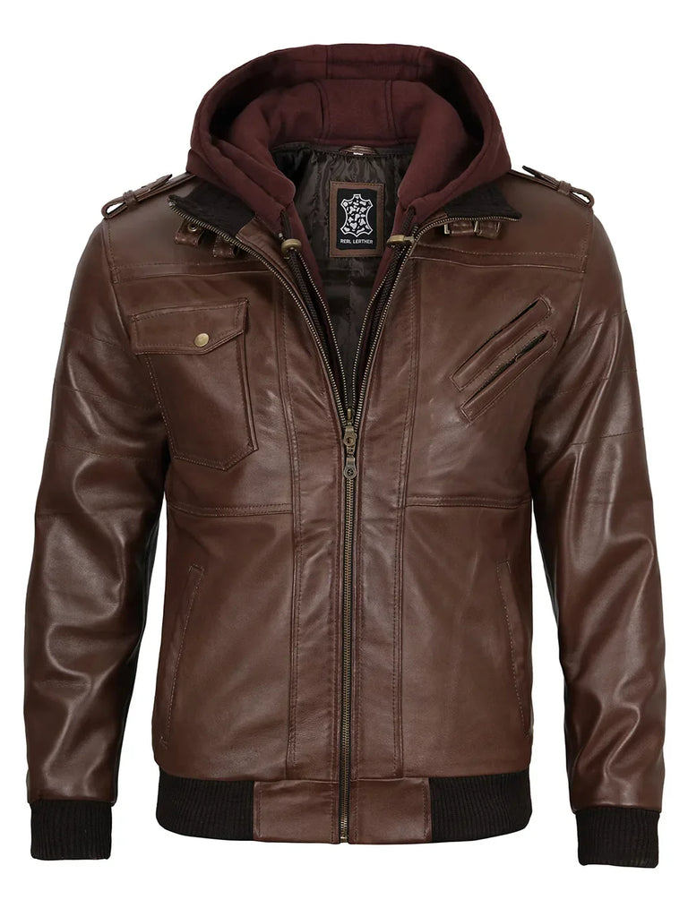- Edinburgh Men's Dark Brown Leather Bomber Jacket With Removable Hood