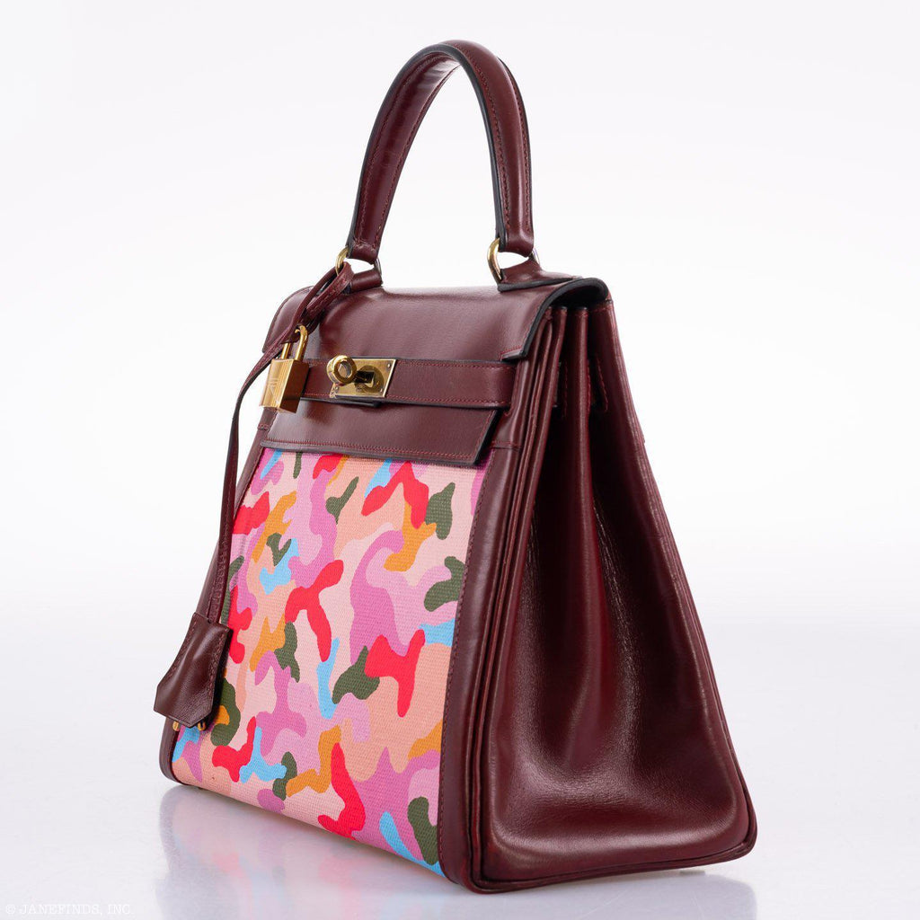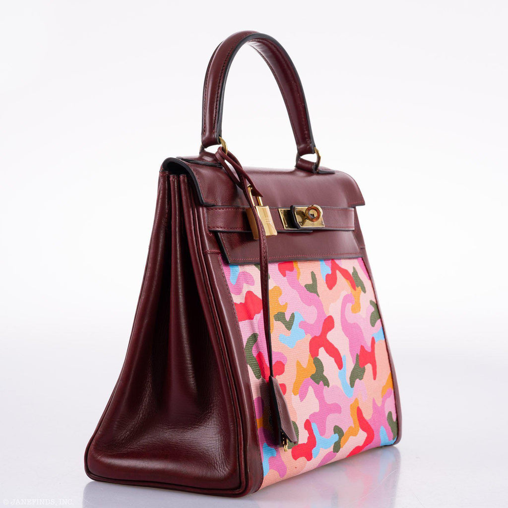 - Vintage Hermes Kelly 28 Retourne Rouge H Calf Box & Toile Camouflage Painting